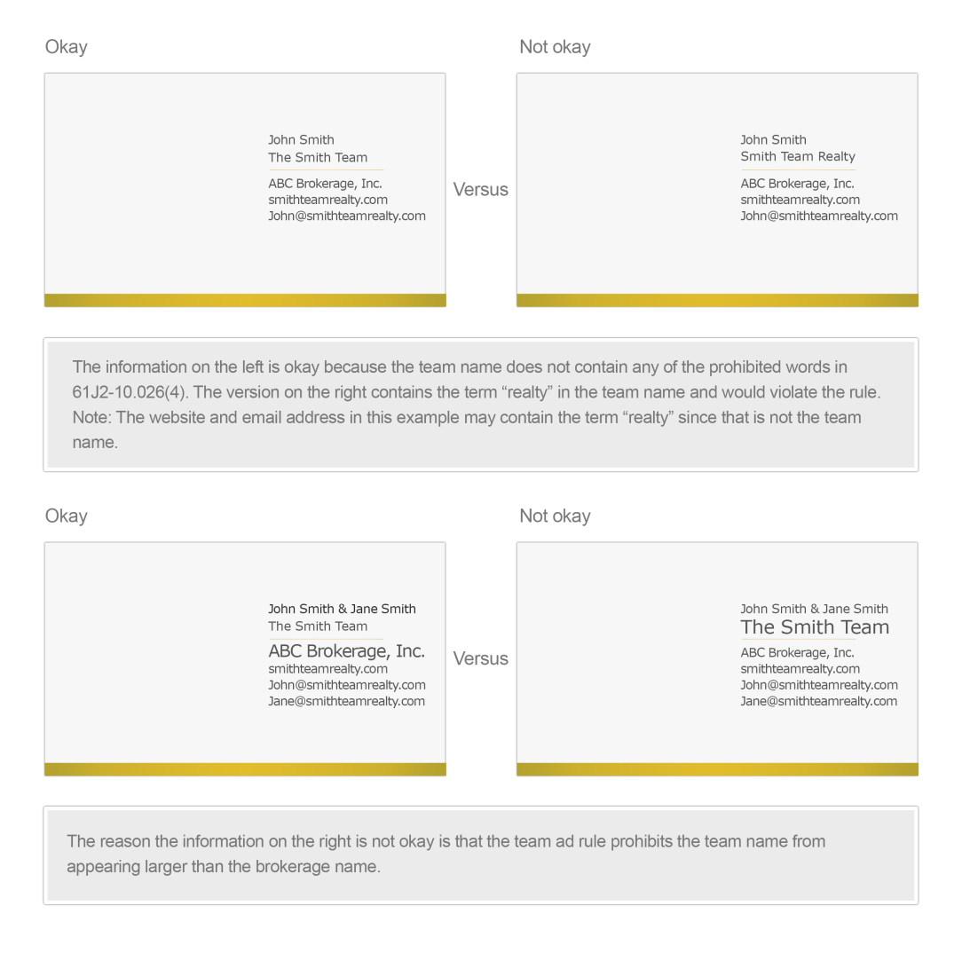 Anytime you add branding to an ad, for example, the team advertising rule needs to be reviewed to determine if it applies because team or group advertising means "a name or logo, used by one or more real estate licensees who represent themselves to the public as a team." If branding is included in the ad that says "We're your home specialists" under the two co-listing agents names, the ad could fall within the team ad rule. This could be true even if it was not the intention of the agents who placed the ad.