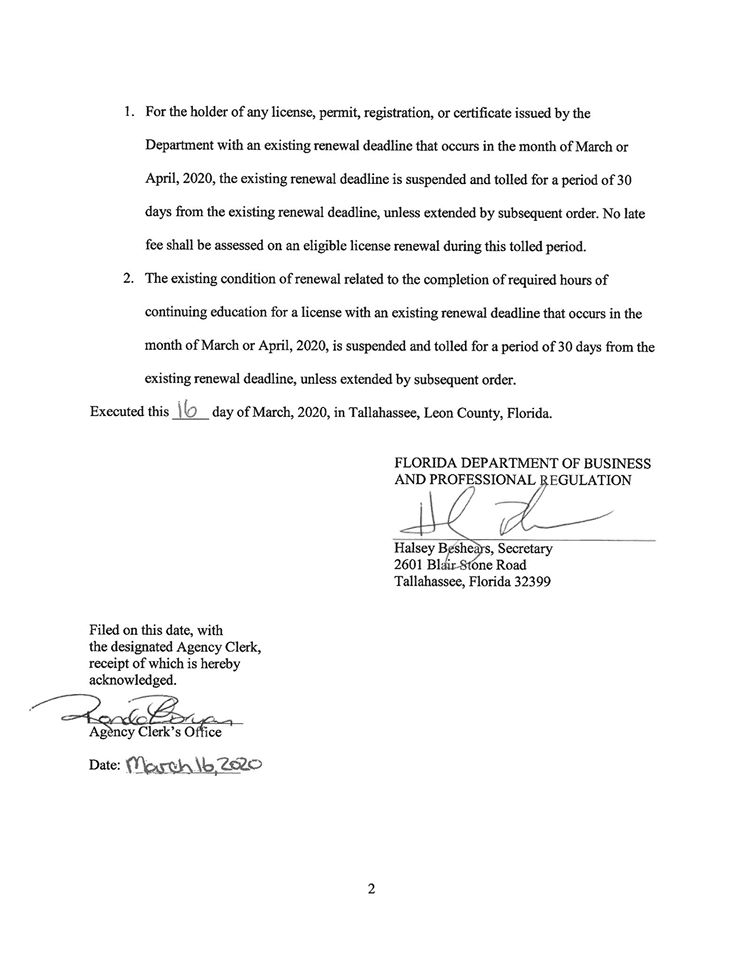 Today, DBPR Secretary Halsey Beshears signed an order extending the March 31, 2020 renewal deadline for real estate licensees for 30 days. The last page of the order explaining the extension is attached for your review.
